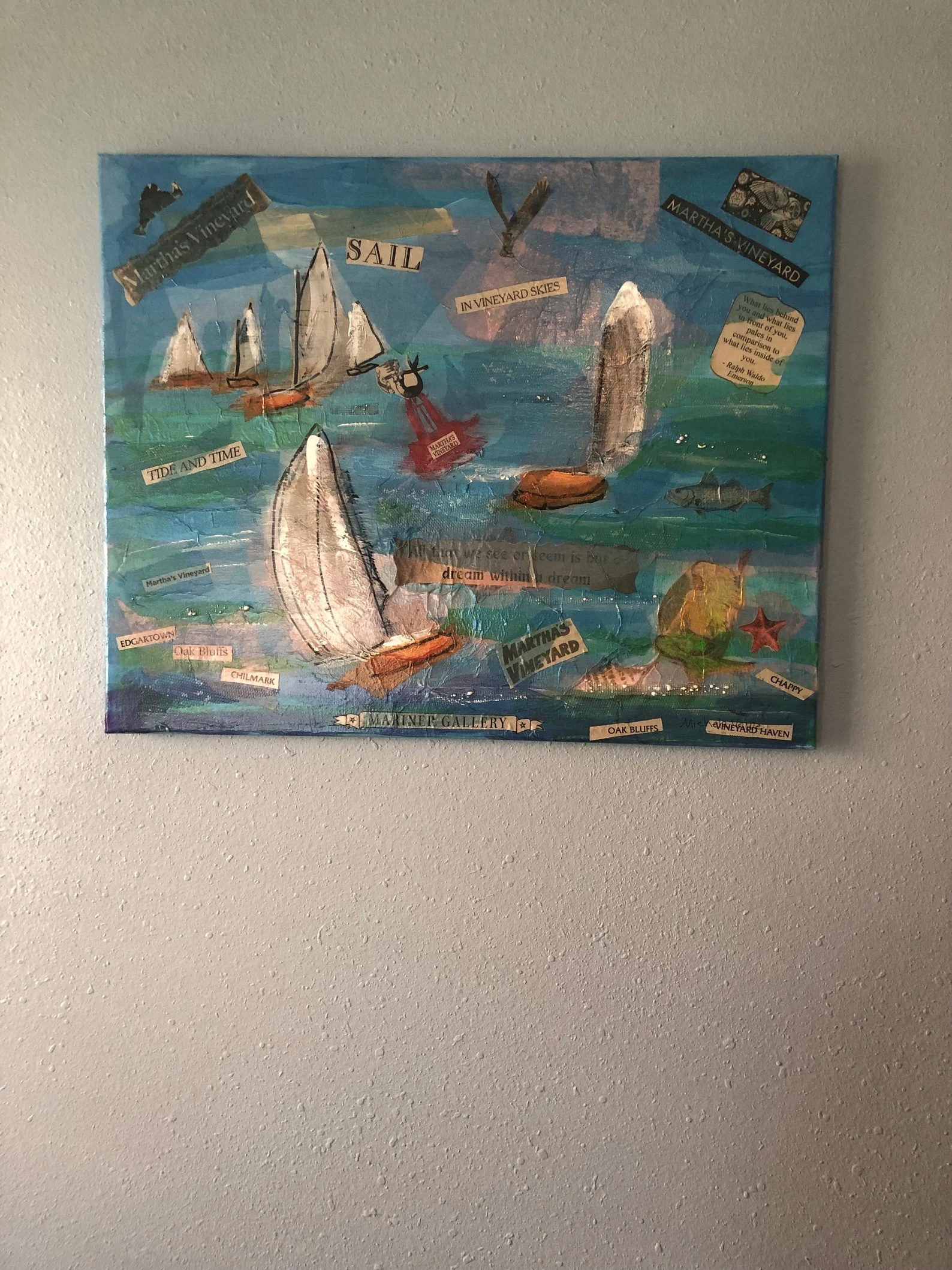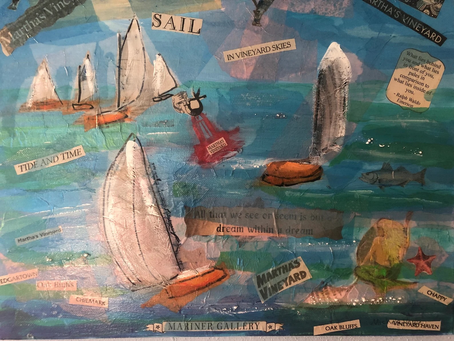 Catboat Regatta on Martha’s Vineyard original Mixed Media Acrylic Painting on a 16X20 Stretched Canvas. Every year in Edgartown on Martha’s Vineyard there is Catboat week. There are special ice creams made by Mad Martha’s and of course the obligatory Catboat parade and regatta. It’s one of my favorite times to be on the Vineyard. There’s a special Catboat painting exhibition at the Old Sculpin gallery that features Island artists. Catboats are one of my favorite sail boats and this week is the best time to see and admire them. This painting is a mixed media painting using newspaper cutouts from the Martha’s Vineyard Gazette, my own mark making and lots and lots of layers of acrylic paint and tissue paper overlays. It would look great hanging in a home of those who love sailing, Martha’s Vineyard and are fans of mixed media art. It took many hours to create this painting and I’m hoping it will find its way to a home who will love it.