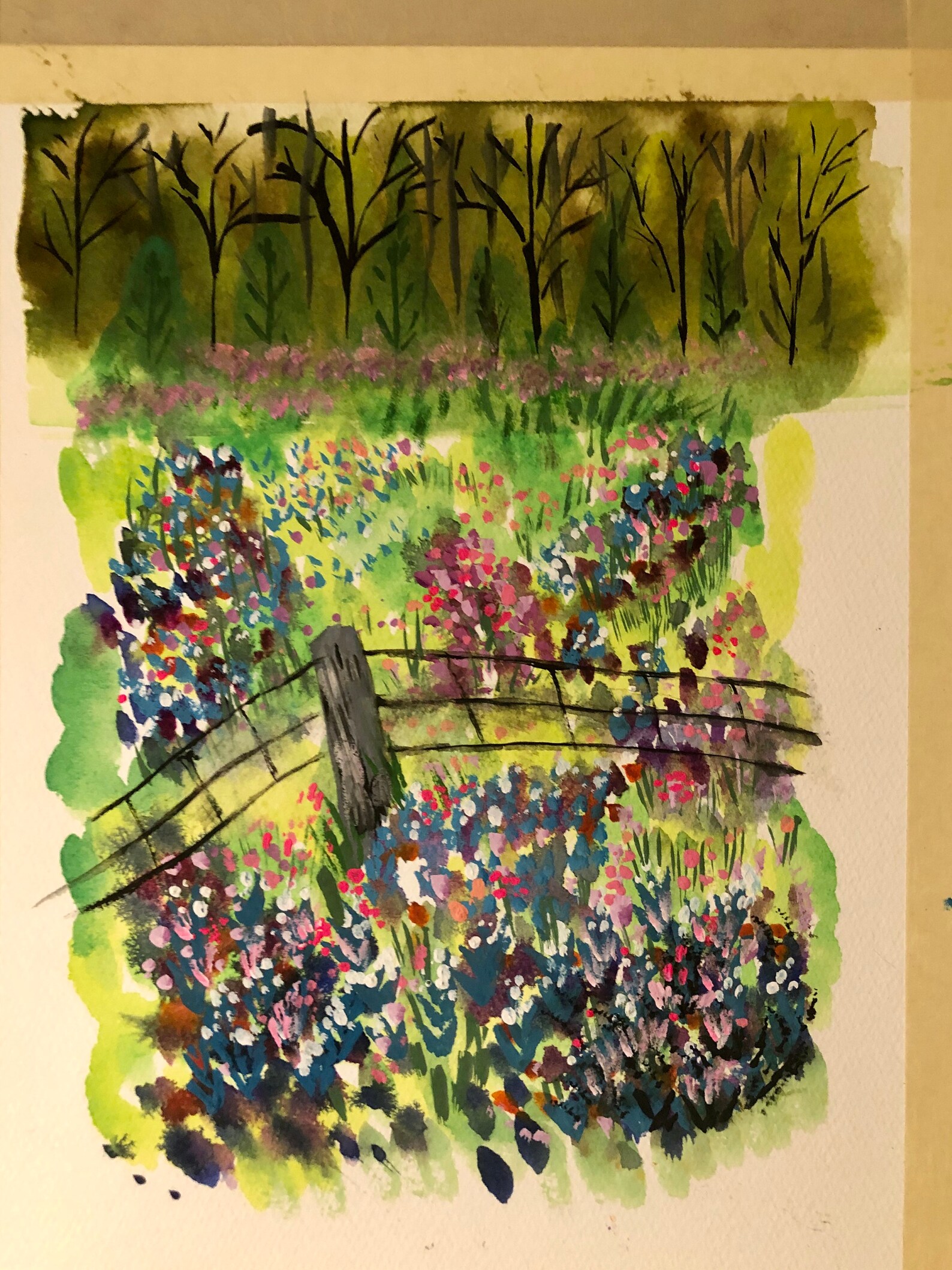 Field of Sunny Wildflowers by Michele Volpe original Watercolor with Gouache accents on 9X12 300lb cotton water color paper. There’s just nothing like walking through a lush field of wildflowers on a sunny day. That was my inspiration for this painting. The colors were bright and happy and you just couldn’t help but feel good walking amongst them. The field hadn’t been hayed in a long time so the seeds of the wildflowers have been able to take over and they were blooming as far as the eye could see. In order to achieve the brightness of some of the flowers, I used Gouache which is an opaque watercolor medium. With it, you are able to achieve bright whites and vibrant colors you can’t when using watercolors by themselves. They complement themselves beautifully. It’s the first time I’ve used them in this way, but I’m very pleased with the results. This painting would look great hanging in a small space and would liven it up. It would complement any decor. I hope you enjoy my painting!